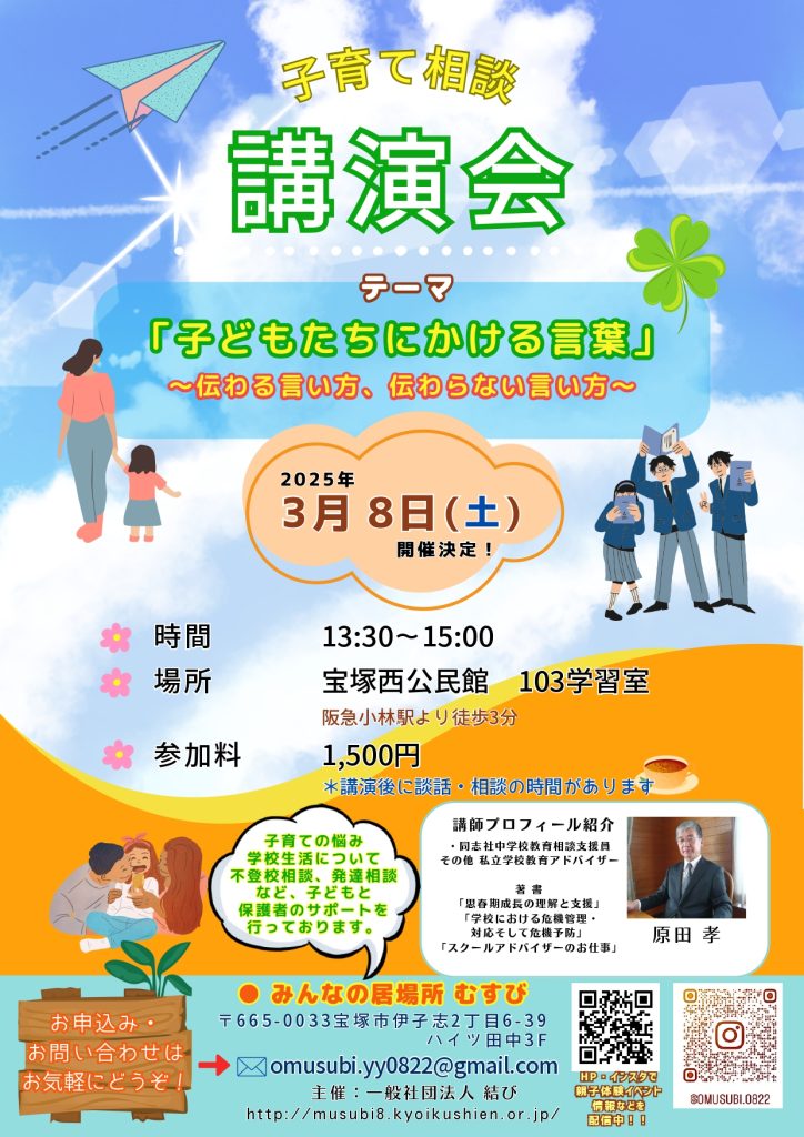 2025年4月8日 / 最終更新日時 : 2025年4月8日 musubihomepage 未分類 2025年3月8日(土)子育て相談講演会「テーマ・子どもたちにかける言葉」 コメントを残すメールアドレスが公開されることはありません。 ※ が付いている欄は必須項目ですコメント ※ 名前 ※ メール ※ サイト 次回のコメントで使用するためブラウザーに自分の名前、メールアドレス、サイトを保存する。 Δ